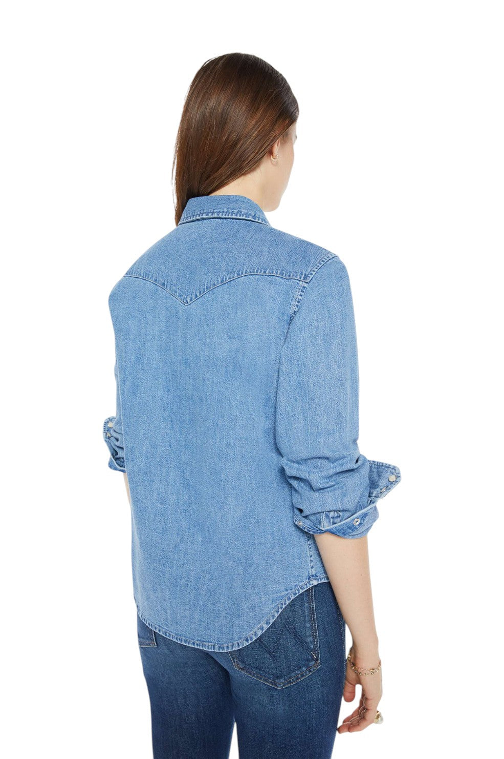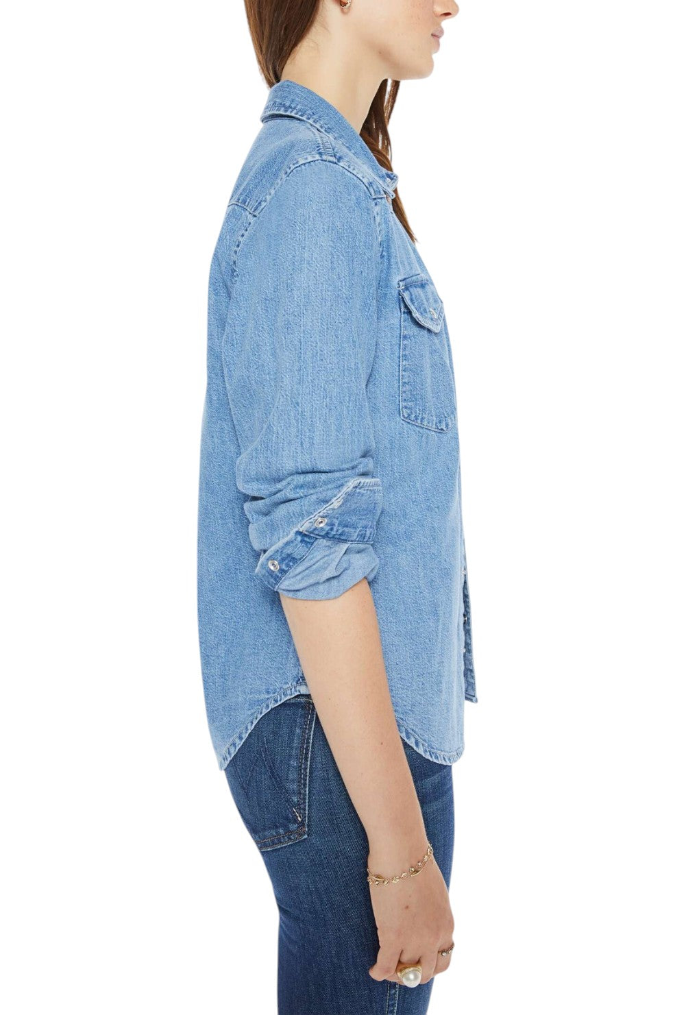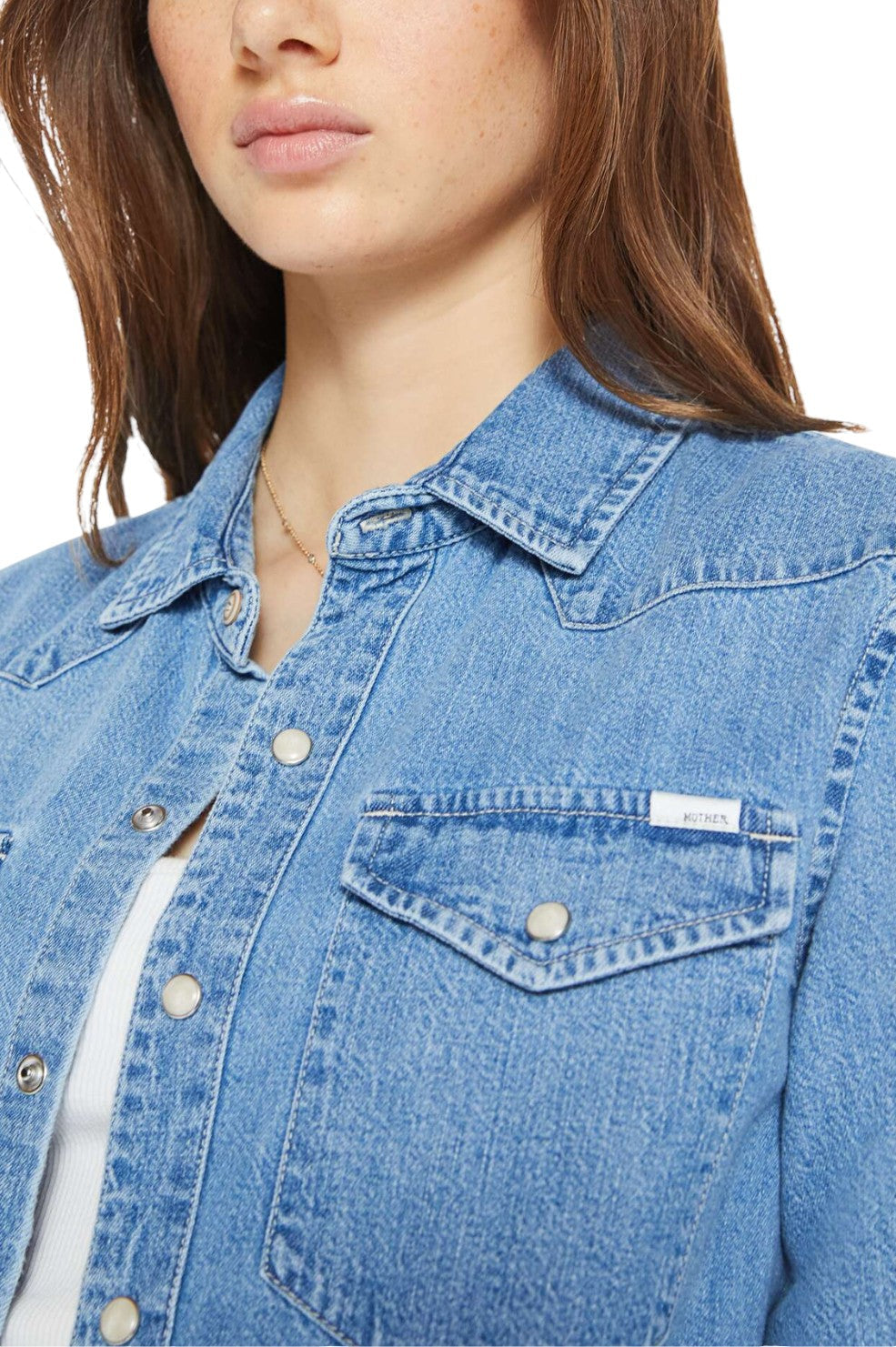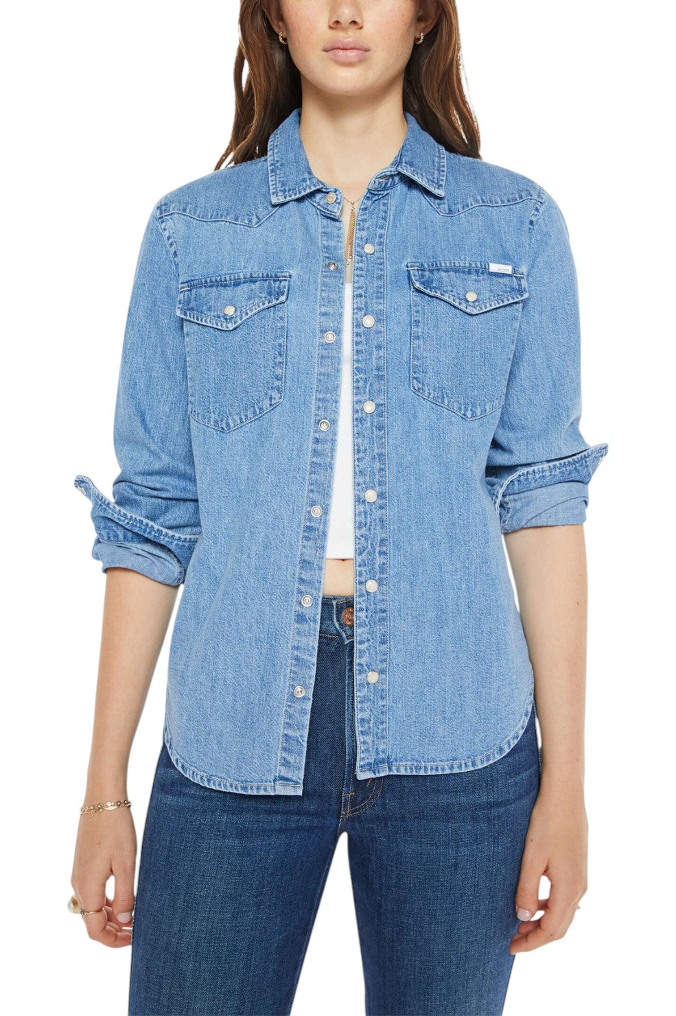 "All My Exes" from MOTHER is a denim dream with a Western twist. This button-up is crafted from 100% cotton and designed with front patch pockets, a curved hem, and faux pearl snaps that elevate its vintage-inspired, faded blue wash. A perfect blend of rugged charm and feminine flair, it's your new go-to for laid-back yet elevated style.