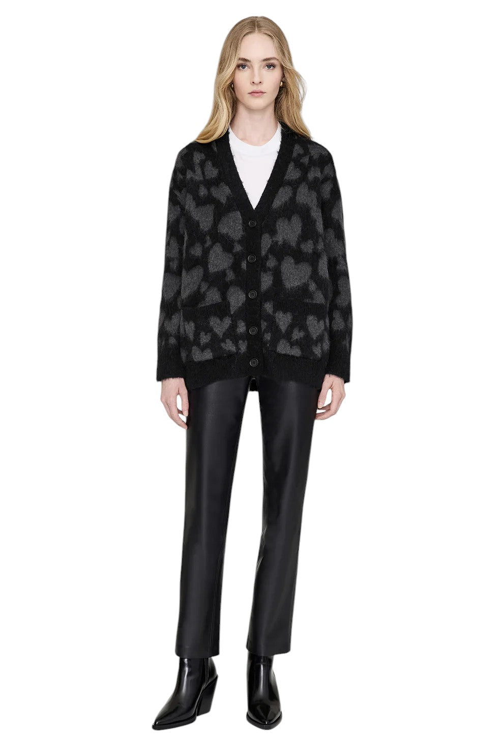 The "Banks Cardigan" from Anine Bing is crafted from a heavyweight alpaca blend with a grey and black heart intarsia design. Featuring a deep V-neckline, oversized silhouette, and front patch pockets, it’s the perfect statement piece for cozy style.