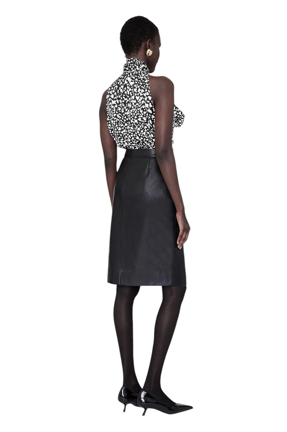 The "Brooke Top" from Anine Bing is made from a luxurious silk-rayon blend with a black and white heart print. This feminine, sleeveless top features a long bow tie at the front and a concealed button with keyhole closure at the back. Designed with a slightly oversized silhouette.