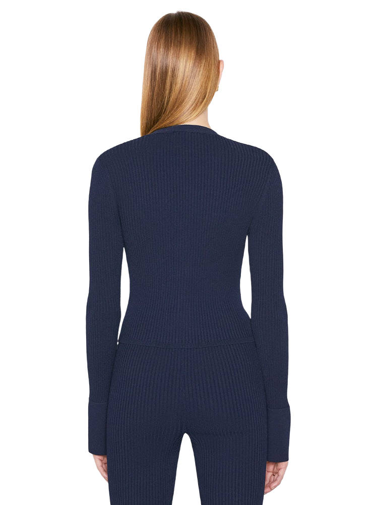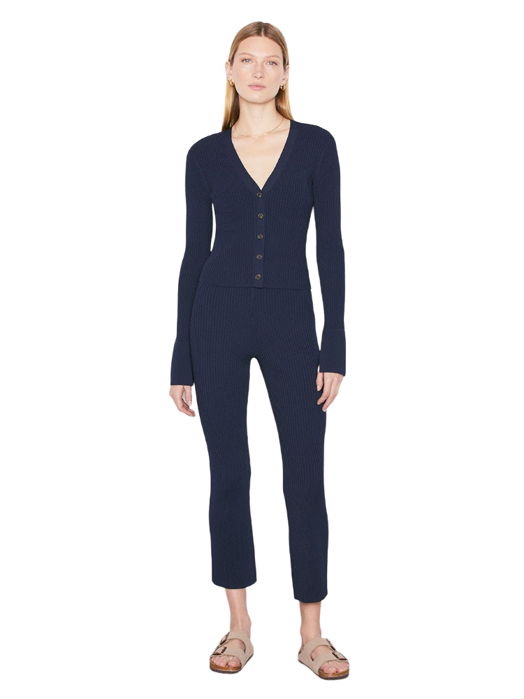 The "Button Front Cardi" from Frame features a flattering close fit that hits at the hip to meet the complementary pant—and any denim, trouser, or mini you pair it with.