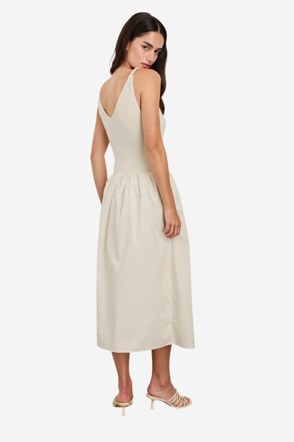 The "Franca Dress" from Rails is where ease meets elegance. With a soft jersey-knit bodice and crisp cotton-blend poplin skirt, this midi silhouette delivers all-day comfort without sacrificing style. Twisted jersey straps and a flattering dropped waist lend it a modern edge, while on-seam pockets add everyday practicality.