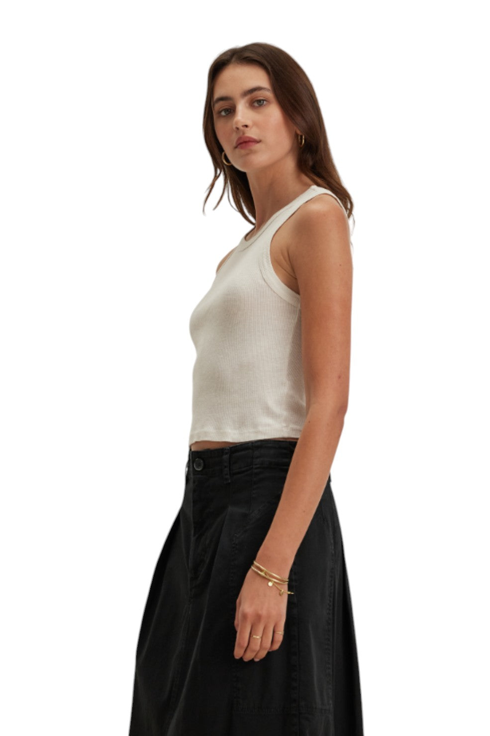 The Harla Tank" from Velvet is made from ribbed cotton slub for a soft, breathable feel. With its fitted silhouette and cropped length, it’s the perfect match for skirts or high-waisted bottoms, creating a casually chic look that’s effortless and stylish.