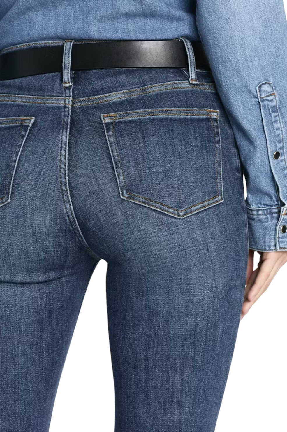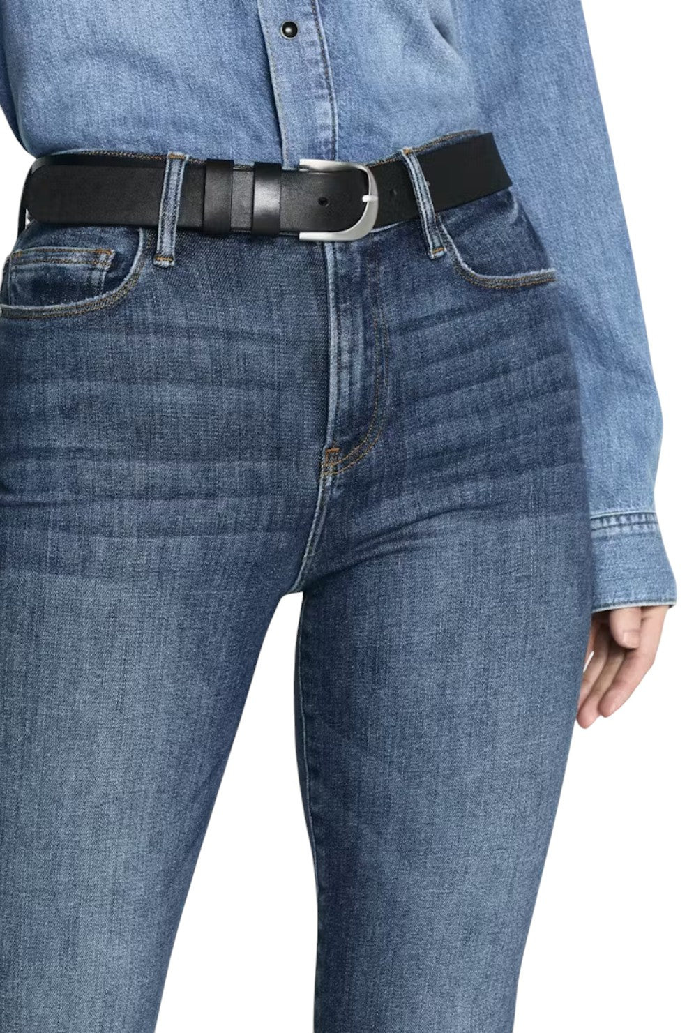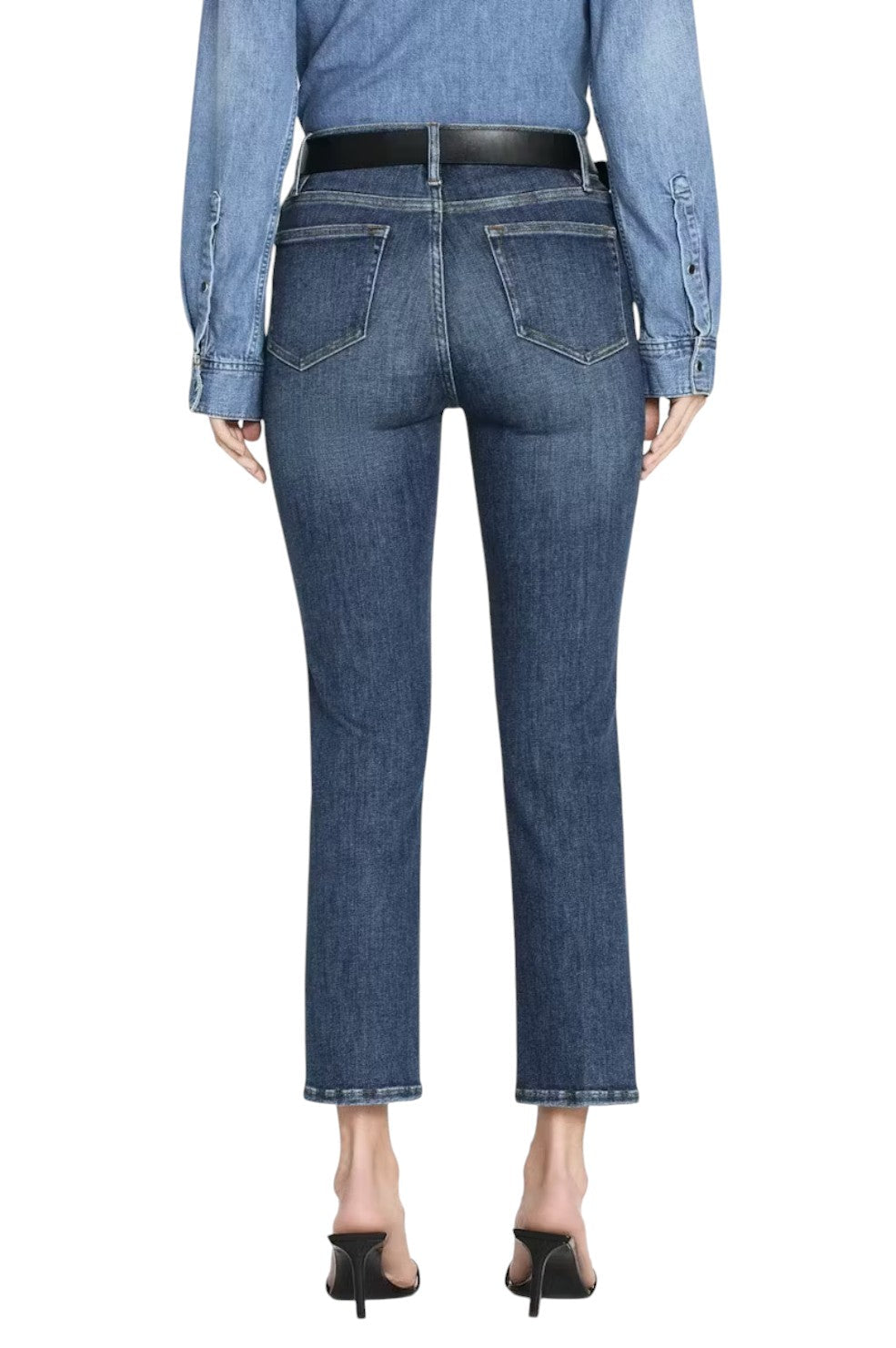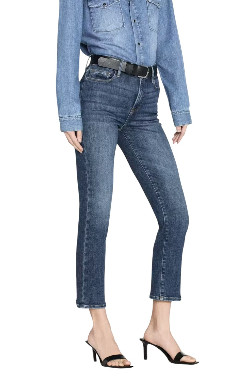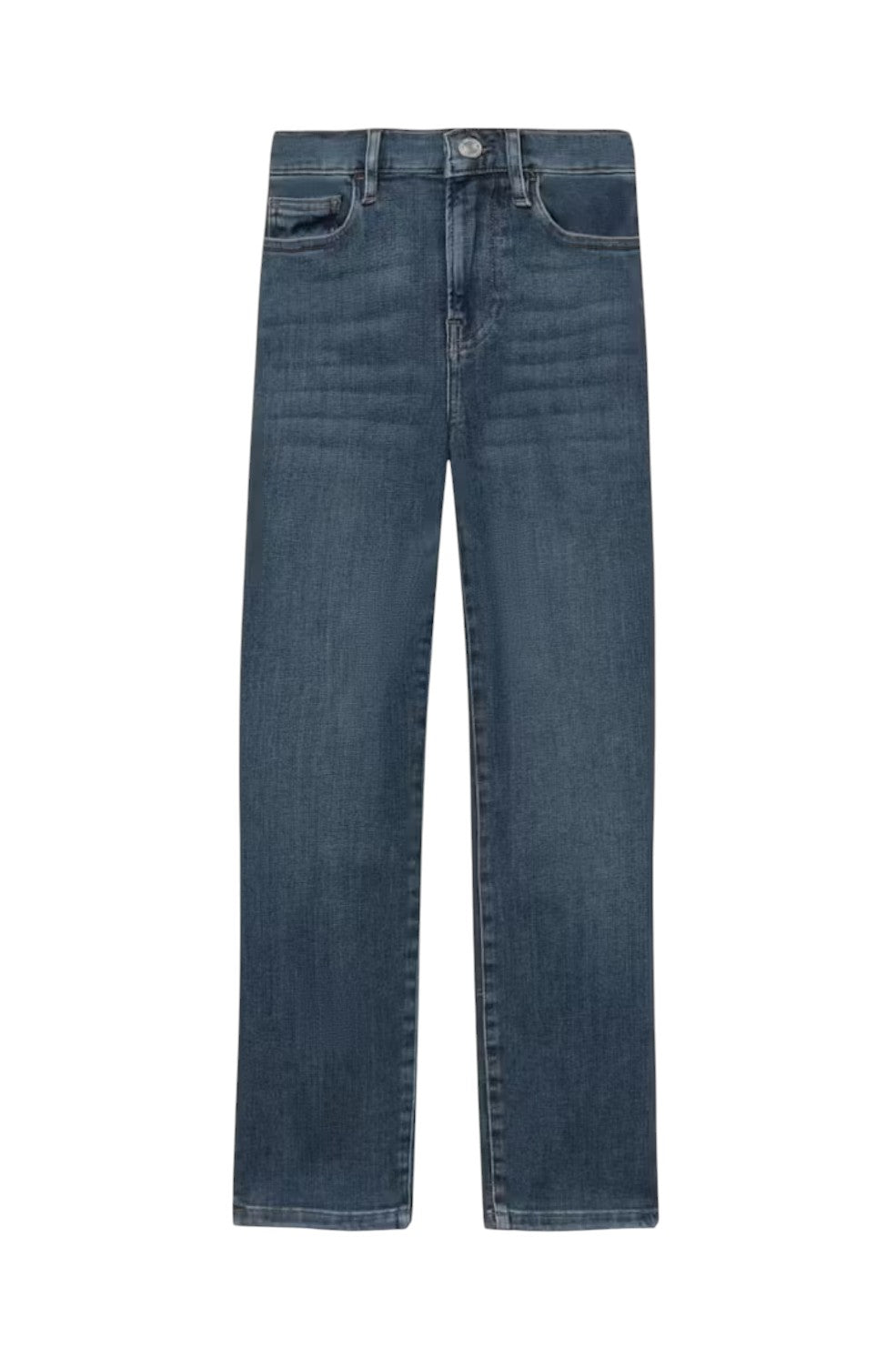 The "High Straight" jean in Bestia from Frame features a tailored straight-leg fit with a high-rise waist and a gentle taper at the knees. The cropped inseam adds a contemporary touch, while the medium-blue wash in premium stretch denim offers versatile style that works effortlessly for both polished and casual outfits.
