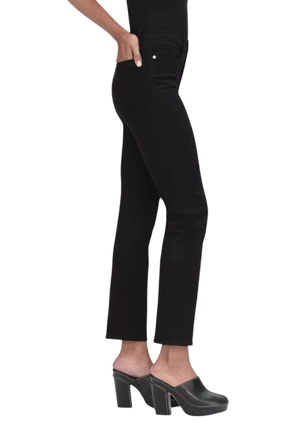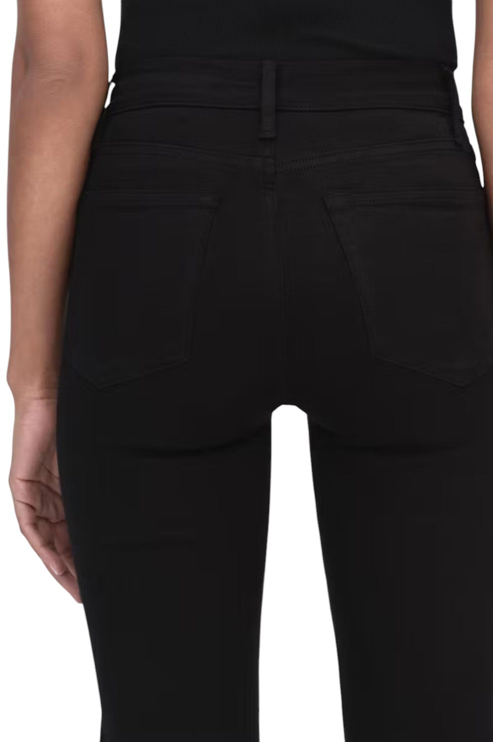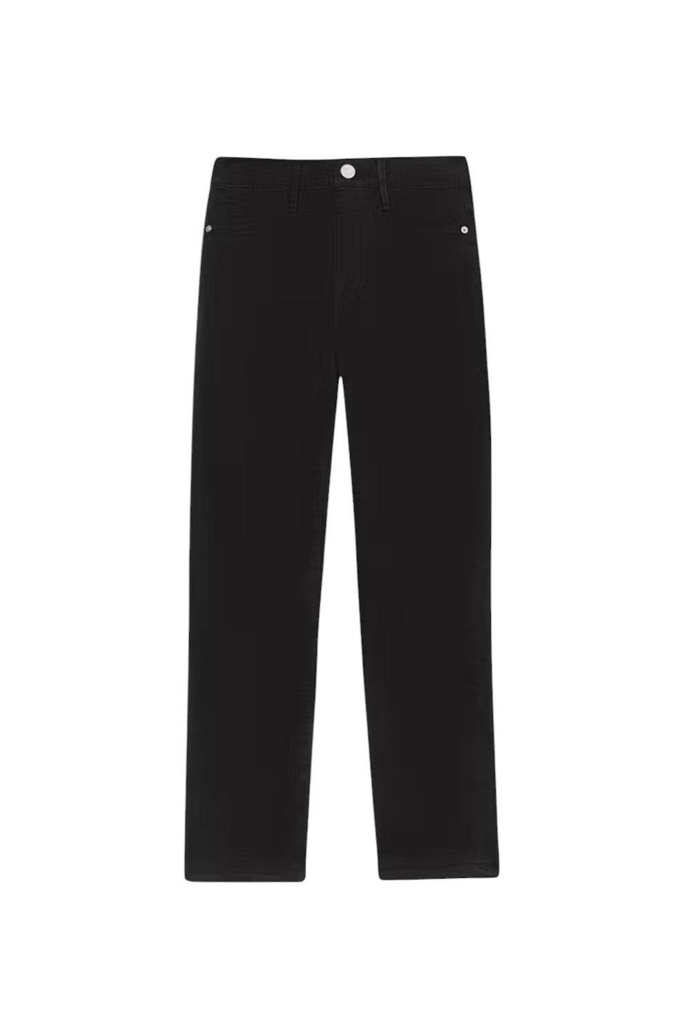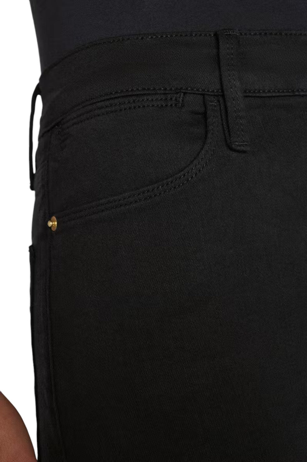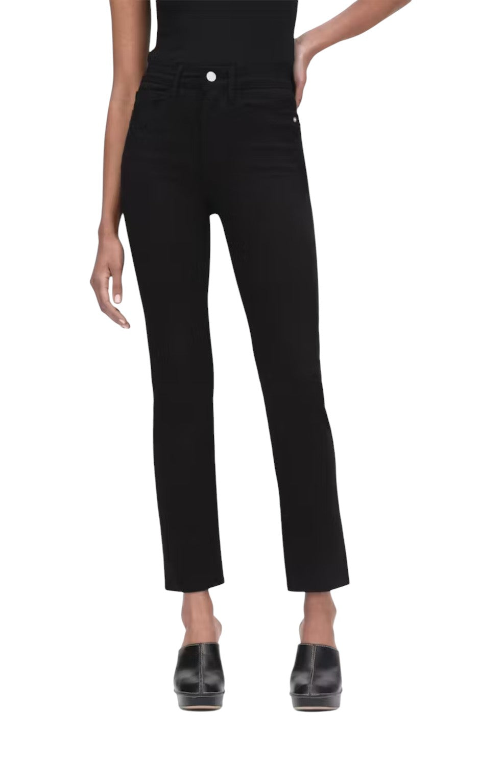 The "High Straight" jean from Frame offers a sleek, slim-fit silhouette with a high-rise waist and a subtle nip at the knee for a flattering shape. The cropped inseam adds a modern touch, while the premium black denim features super stretch and excellent recovery, ensuring comfort and a perfect fit that lasts.