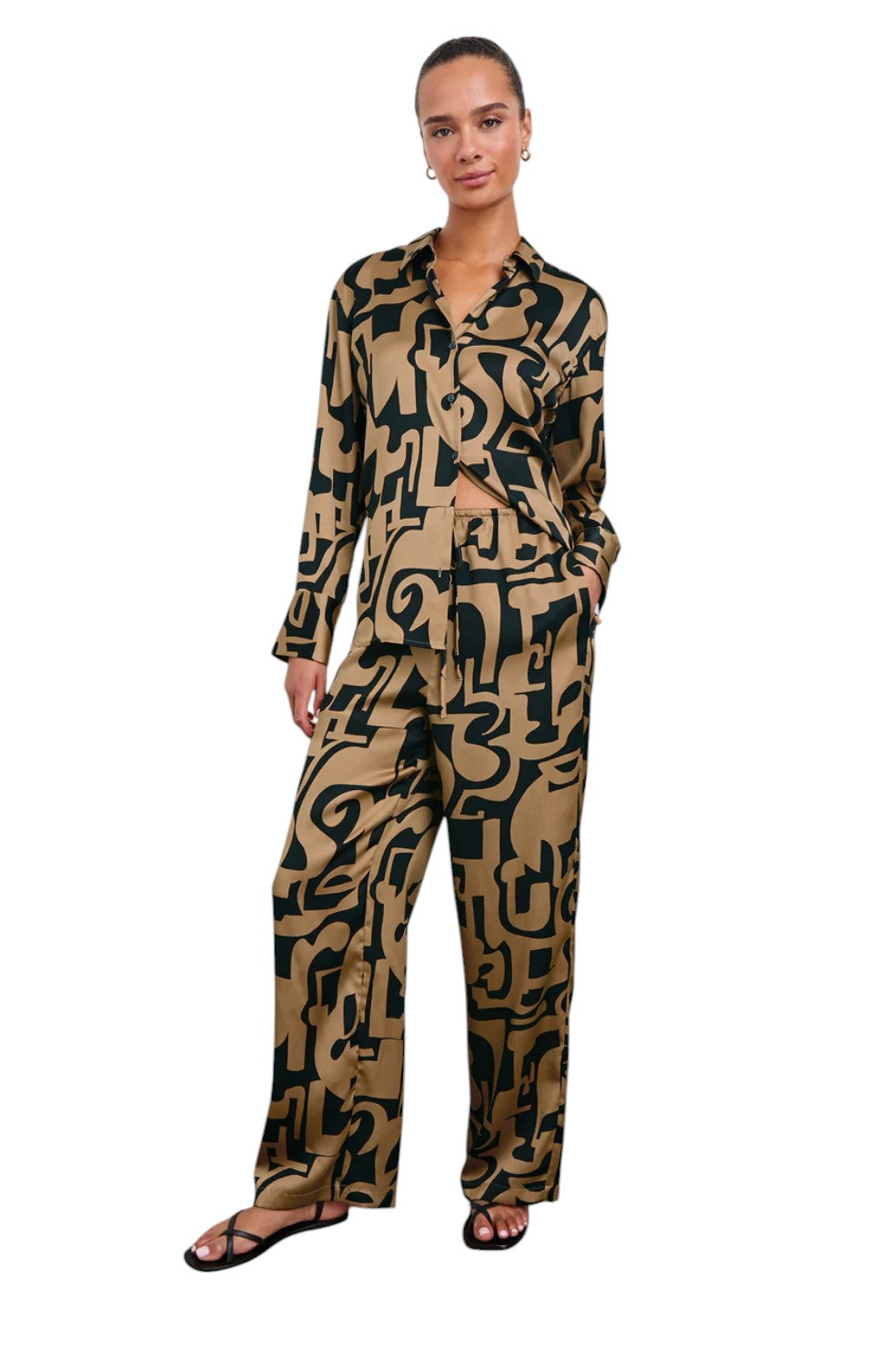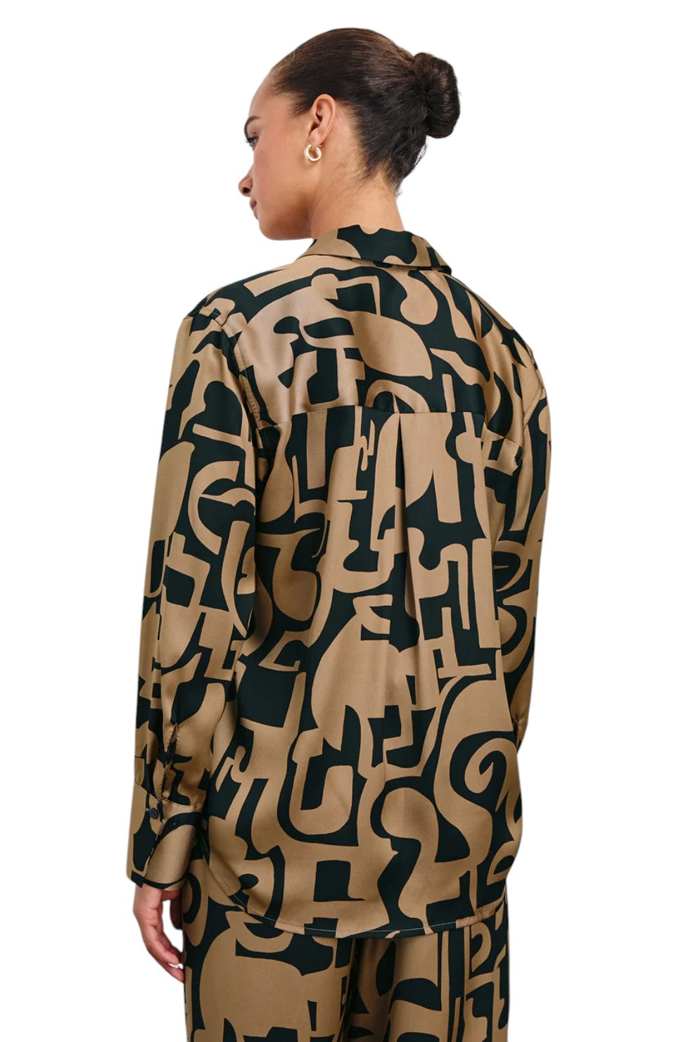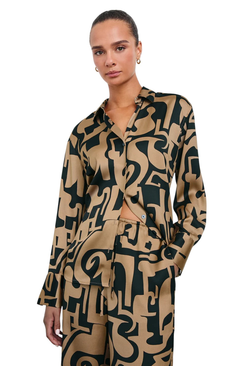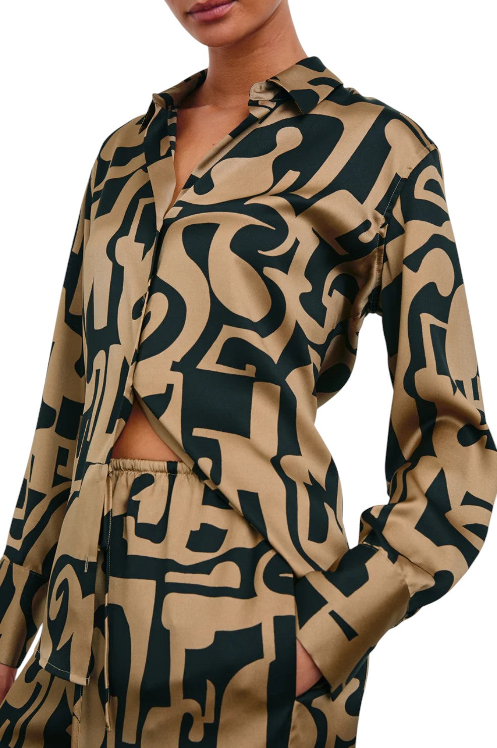 The "Ledger Top" from Rails is crafted in shiny twill, offering a soft, sleek feel with a relaxed fit and statement-making print. Tuck it in, layer over a tank, or pair with the "Damani Pant" for a complete look.
