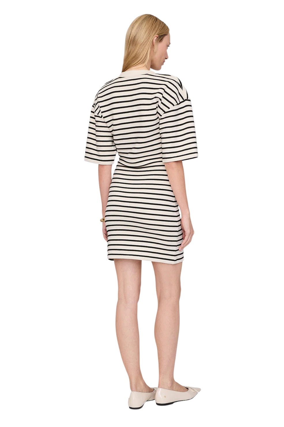 The "Mona Dress" from Anine Bing blends Parisian cool with casual comfort in a modern, structured silhouette. Crafted from midweight cotton French terry, this mini dress features timeless black-and-white Breton stripes and a flattering close fit. Voluminous short sleeves with removable shoulder pads add a sculptural touch, while an ivory monogram embroidered at the chest gives it that signature Anine Bing edge. It's a versatile piece that pairs perfectly with sneakers, slides, or a bold red lip.