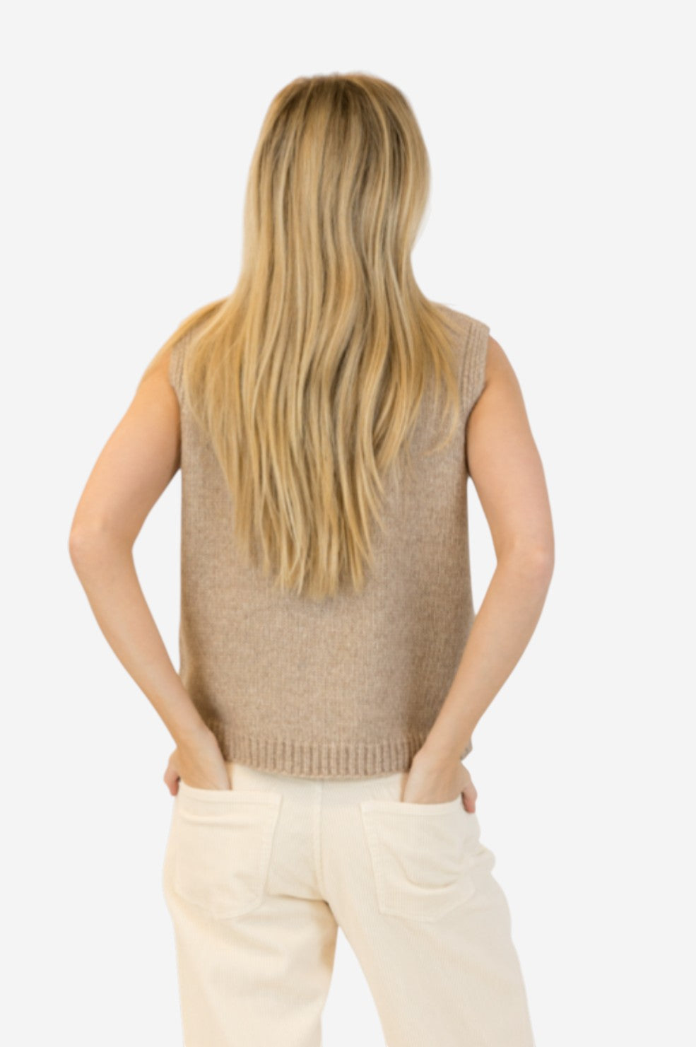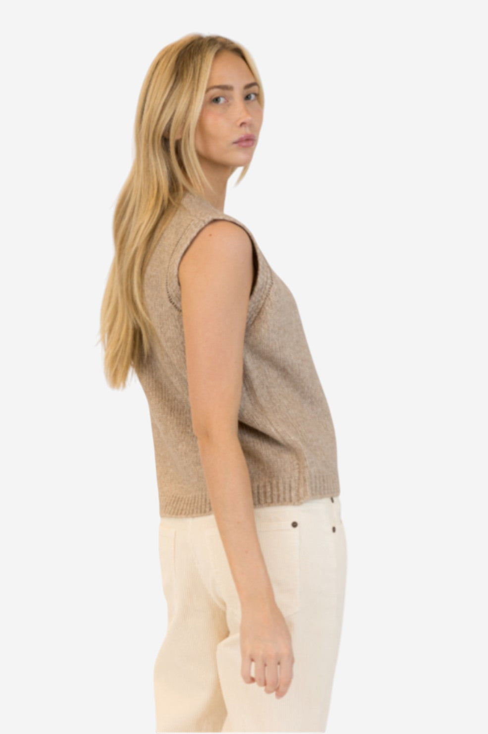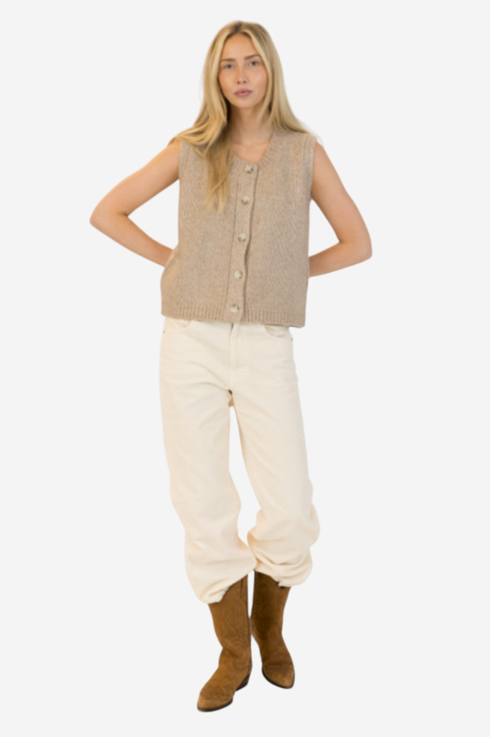 The "Pam Vest" from Lyla + Luxe is a modern take on the classic sweater vest—sleeveless and softly structured with a boxy silhouette. Rendered in a warm tan hue and finished with front buttons, it’s an effortless layer for transitional styling.