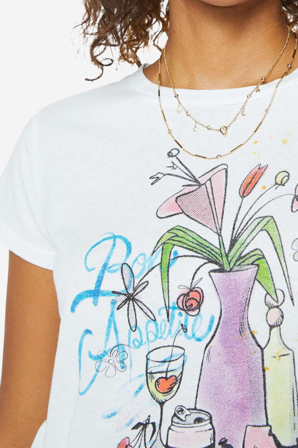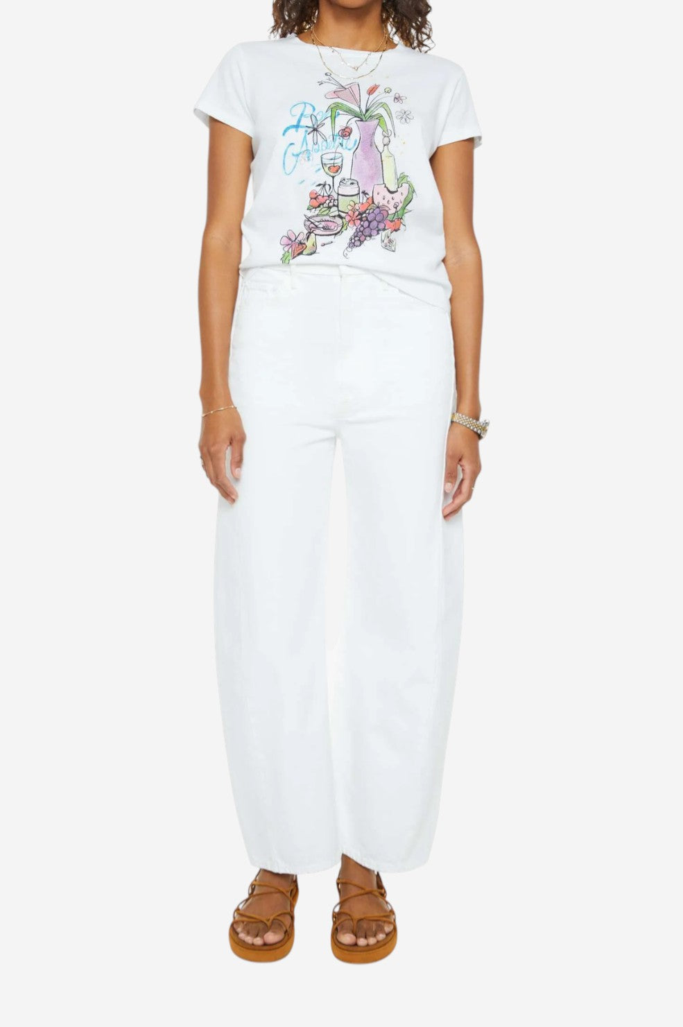 The "Boxy Goodie Goodie" from MOTHER brings a touch of nostalgia to your everyday tee rotation. Cut from soft, 100% cotton with a vintage-inspired slim fit, this crewneck feels lived-in from the first wear. A colorful, hand-drawn still life graphic and playful blue text add a punch of personality to the crisp white base—making it the perfect companion to denim, trousers, or layered under a blazer for an unexpected twist.
