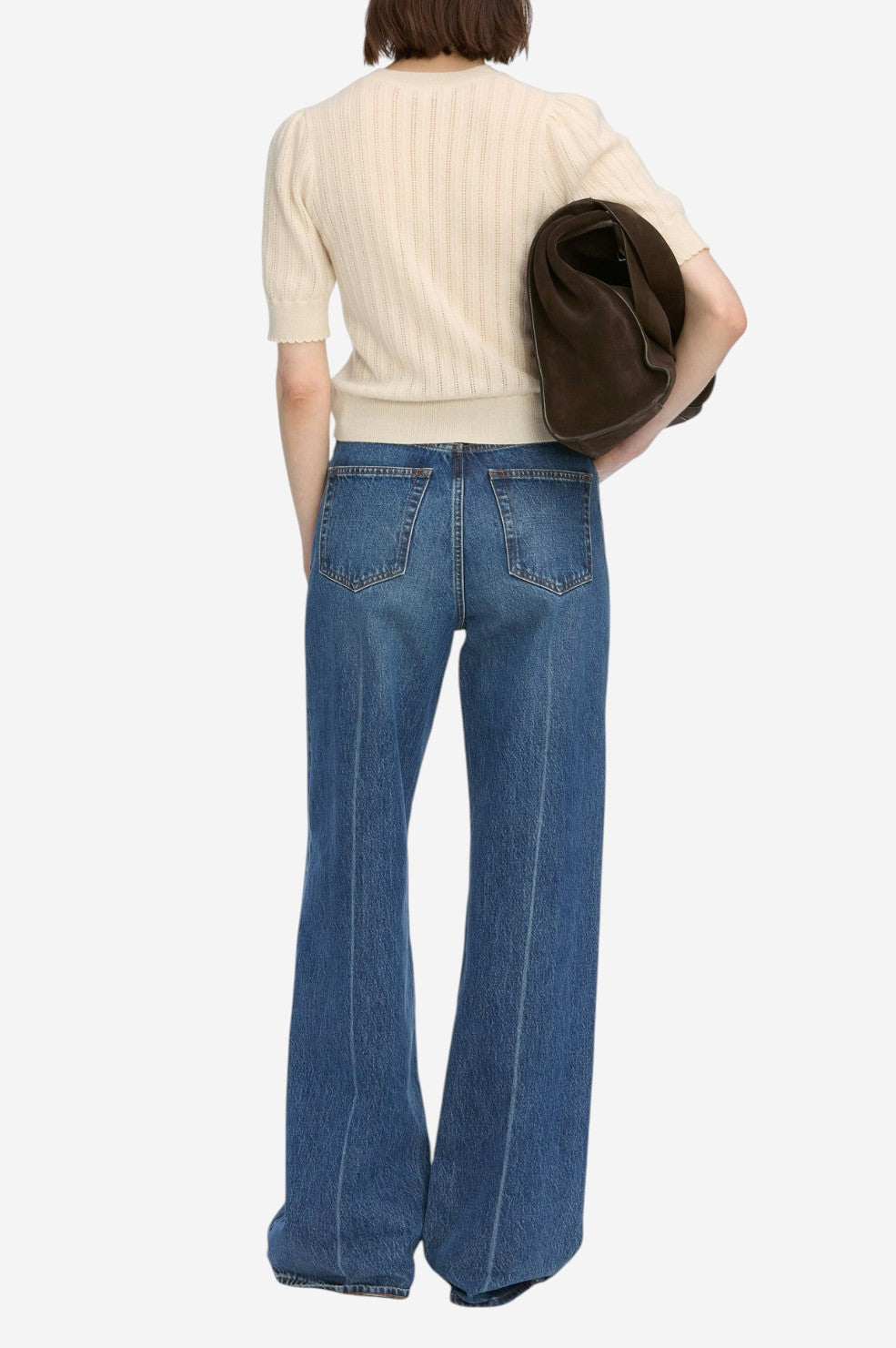 The "Ladder Pointelle Sweater" from FRAME features a lightweight cashmere knit with an airy ladder pointelle stitching and softly scalloped edges, creating an effortless, feminine feel.