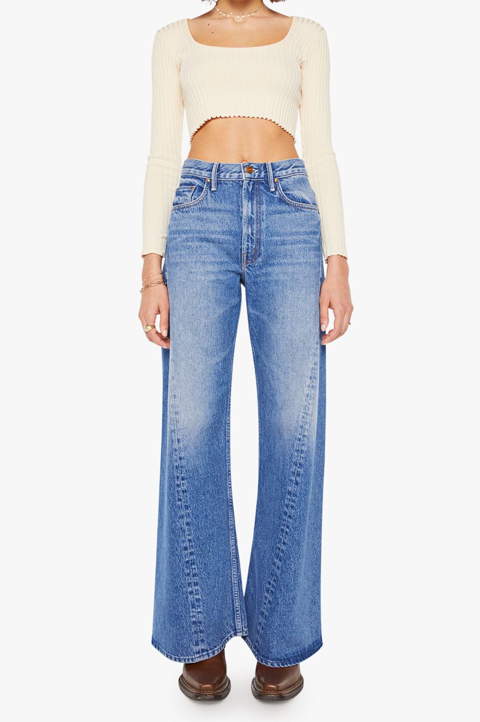 The "Lemon Twist Sneak" from MOTHER’s SNACKS! collection delivers playful proportions and vintage attitude. This ultra high-rise style features an exaggerated wide leg with a subtly curved outer seam and extra-long 33.5" inseam. Finished with a clean hem, novelty pretzel button, and candy-inspired rivets, it's a standout made for denim lovers who like their jeans with a twist.