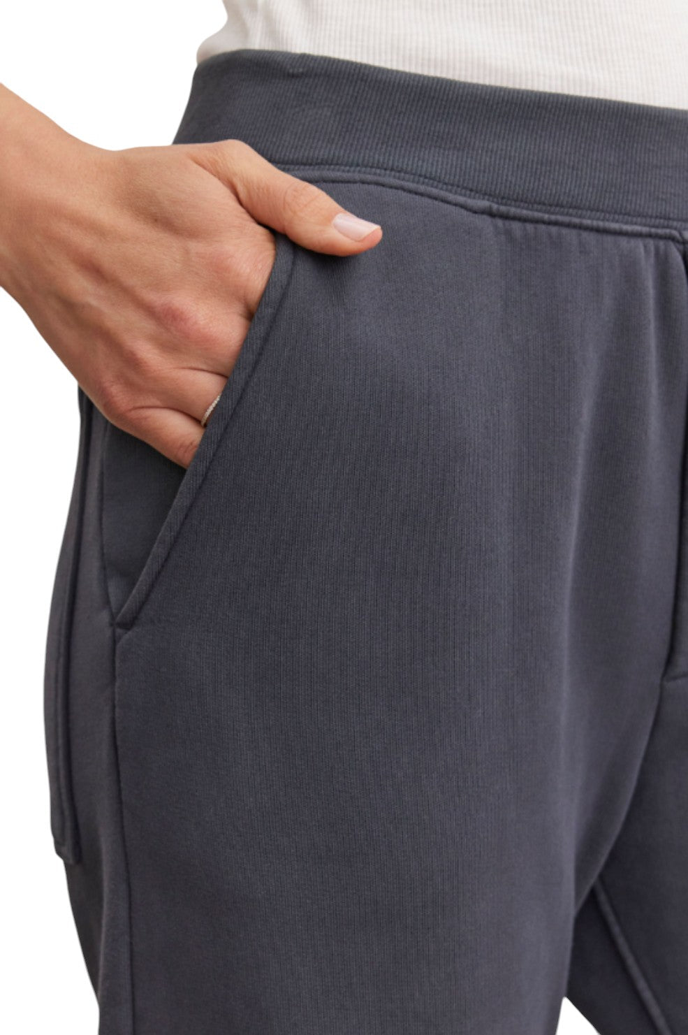 The "Matti Pant" from Velvet in a dark grey wash adds a timeless touch to the effortlessly stylish fleece pant. Complete the look with the Cecilia Hoodie for a comfortable and chic ensemble.