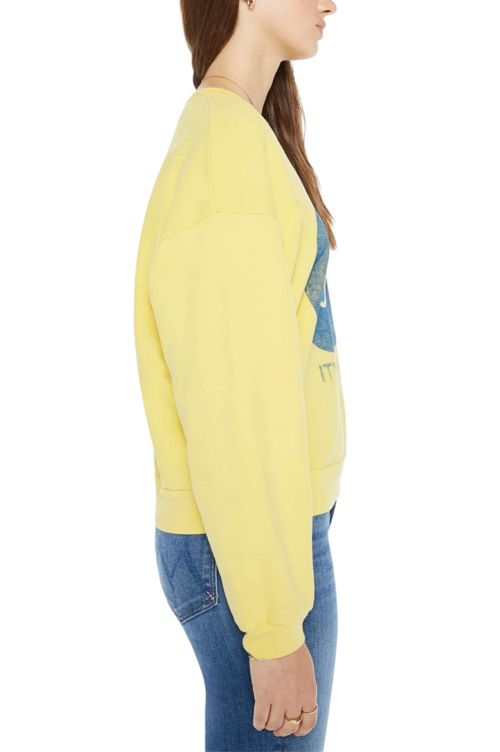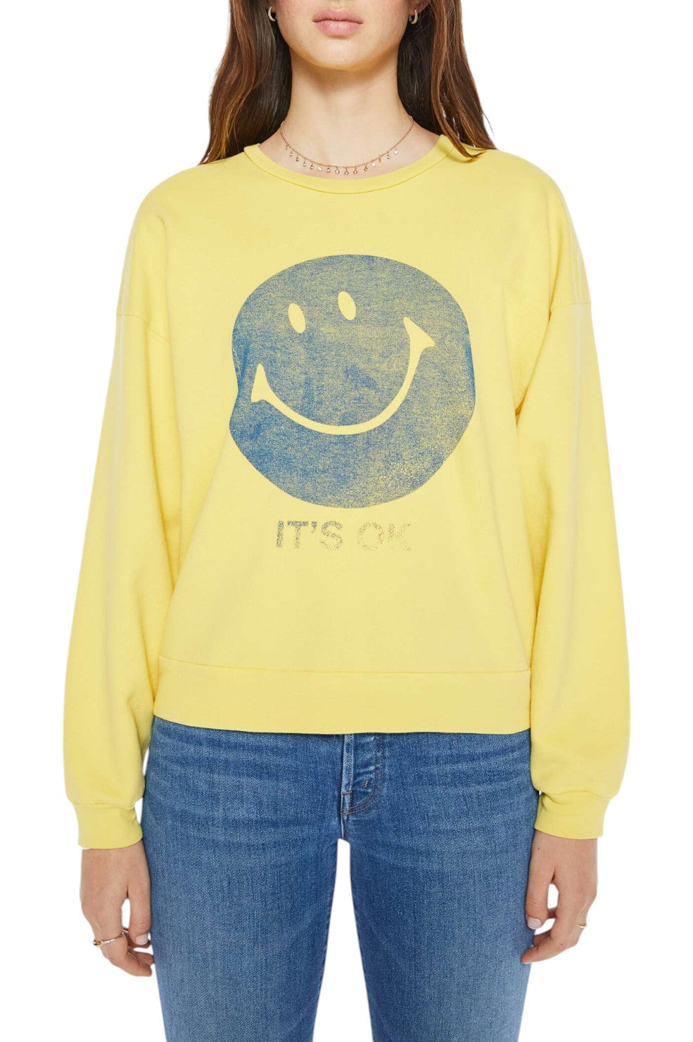 "The Drop Square" sweatshirt from MOTHER features a faded smiley face and text in blue on the front, and features drop shoulders and a relaxed fit.