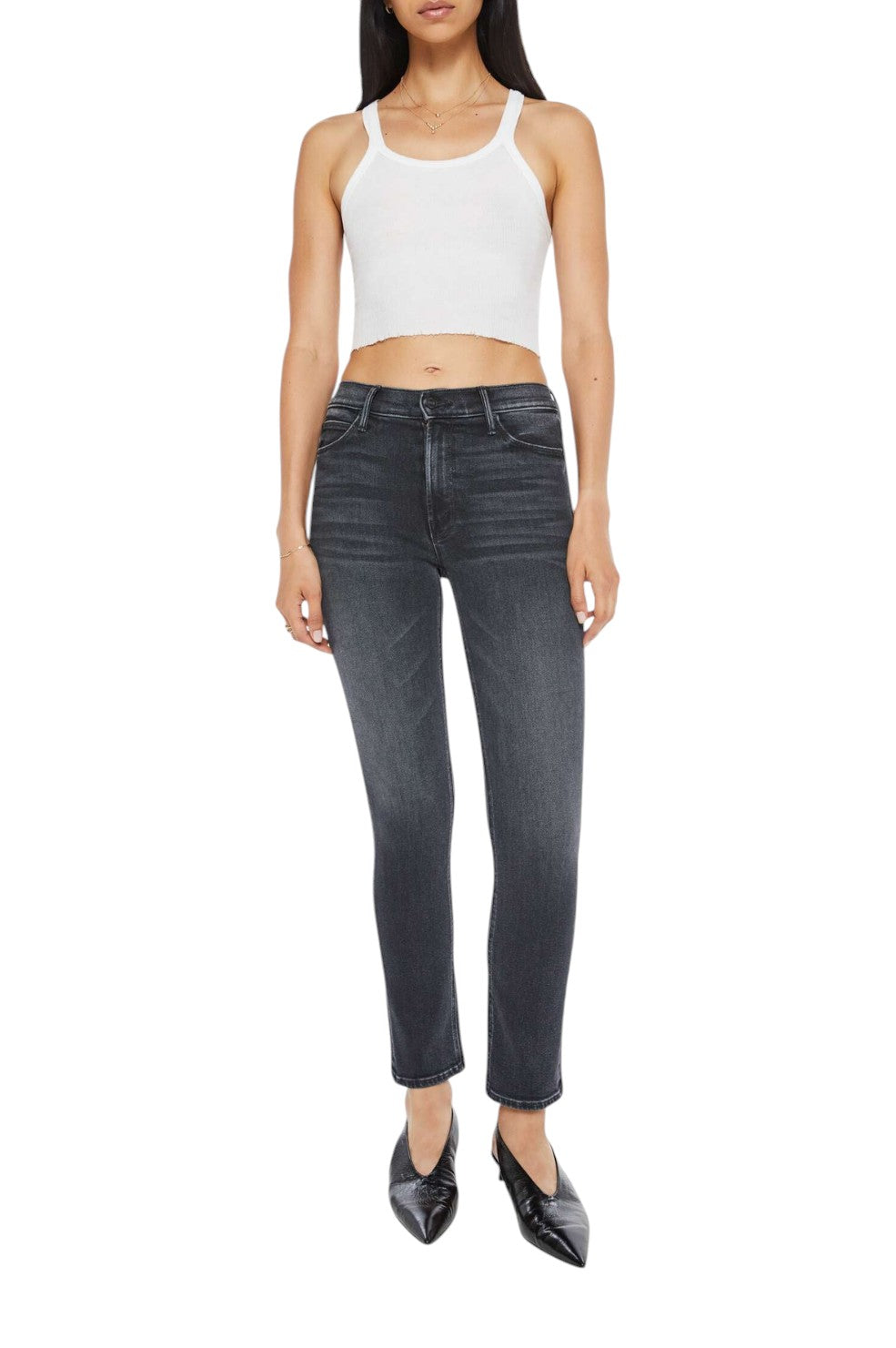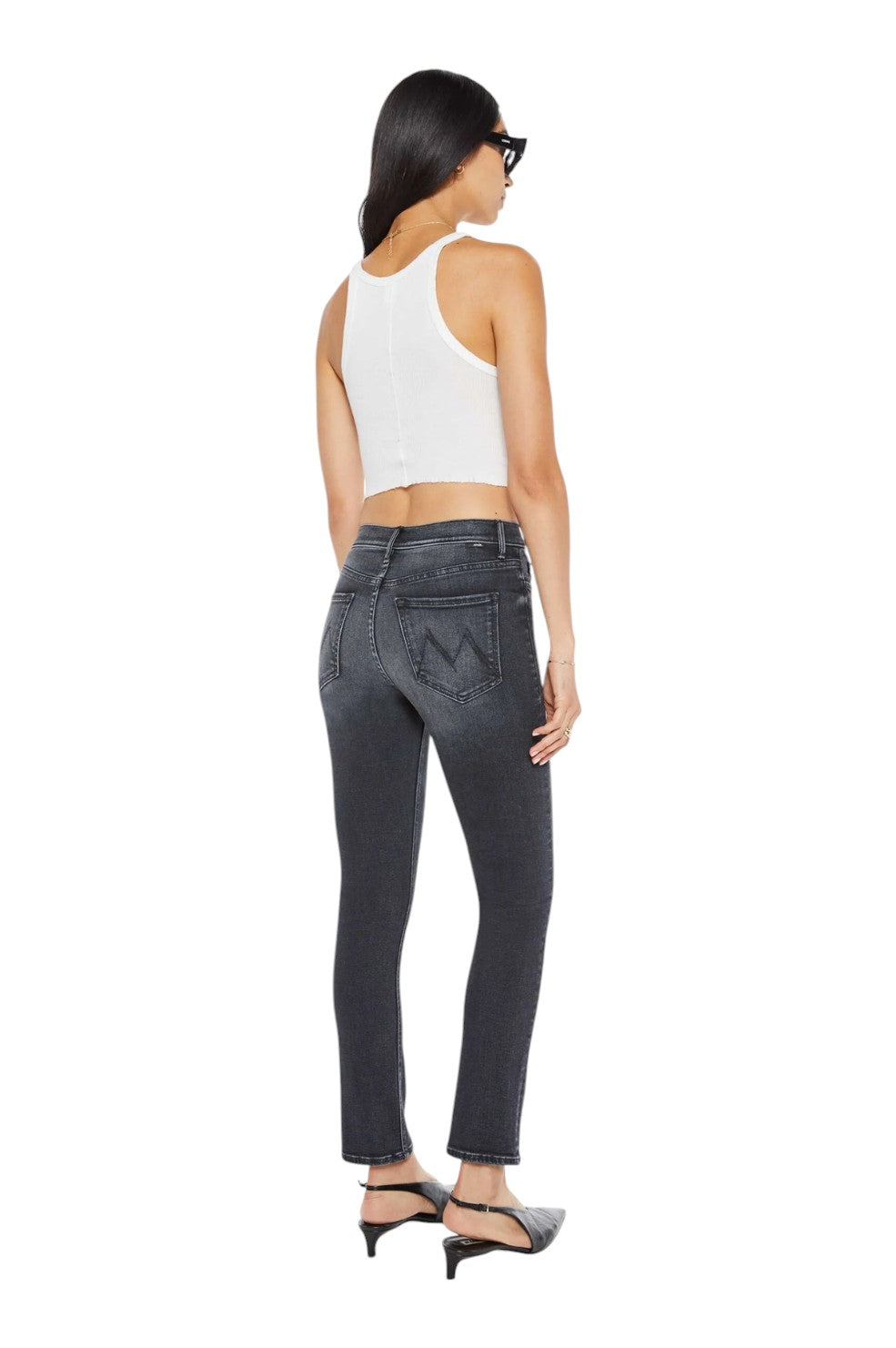 Introducing the "Mid Rise Dazzler Flood - Not Today Satan" from MOTHER. Made with stretch denim, these mid-rise straight leg jeans offer a clean hem and a flattering 28.25-inch inseam. The washed black color features whiskering, fading, and tonal hardware for a bold, yet versatile look.
