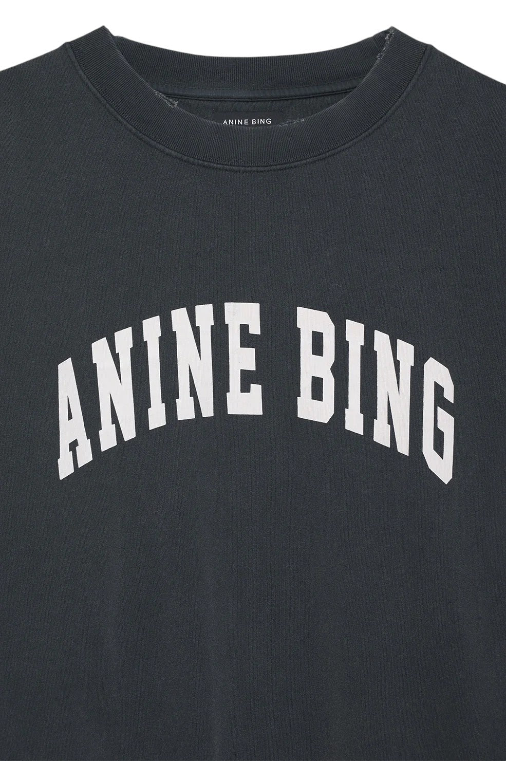The "Tyler Sweatshirt" from Anine Bing is an oversized crewneck pullover made from midweight 100% cotton fleece in washed black. It features contrast white collegiate lettering on the chest and distressed ribbed trim at the collar, cuffs, and hem for a vintage-inspired look. Take your true size.