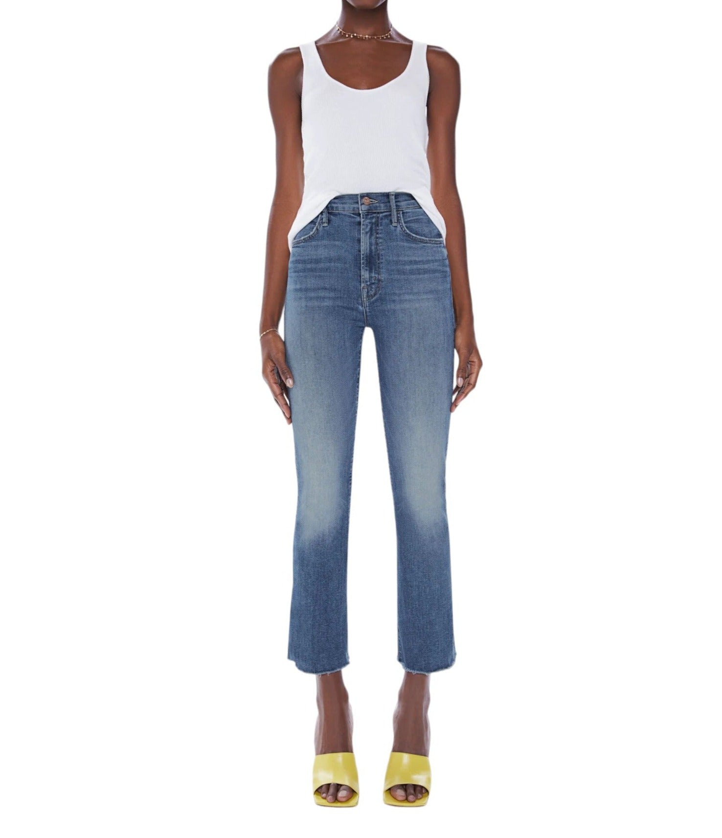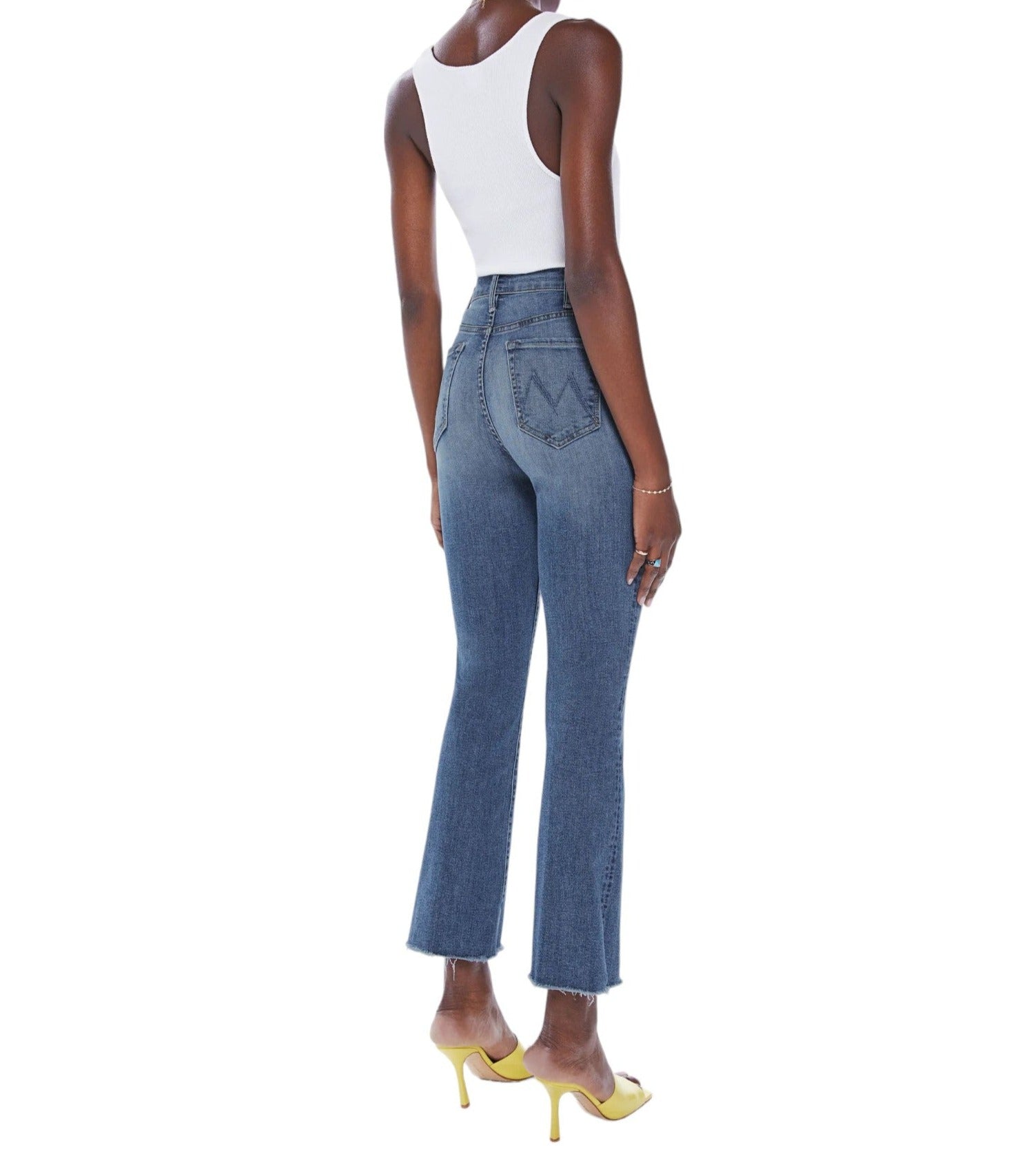 The "Hustler Ankle Fray - Healing Jar" from MOTHER features a high-rise flare has an ankle-length inseam and a raw hem.