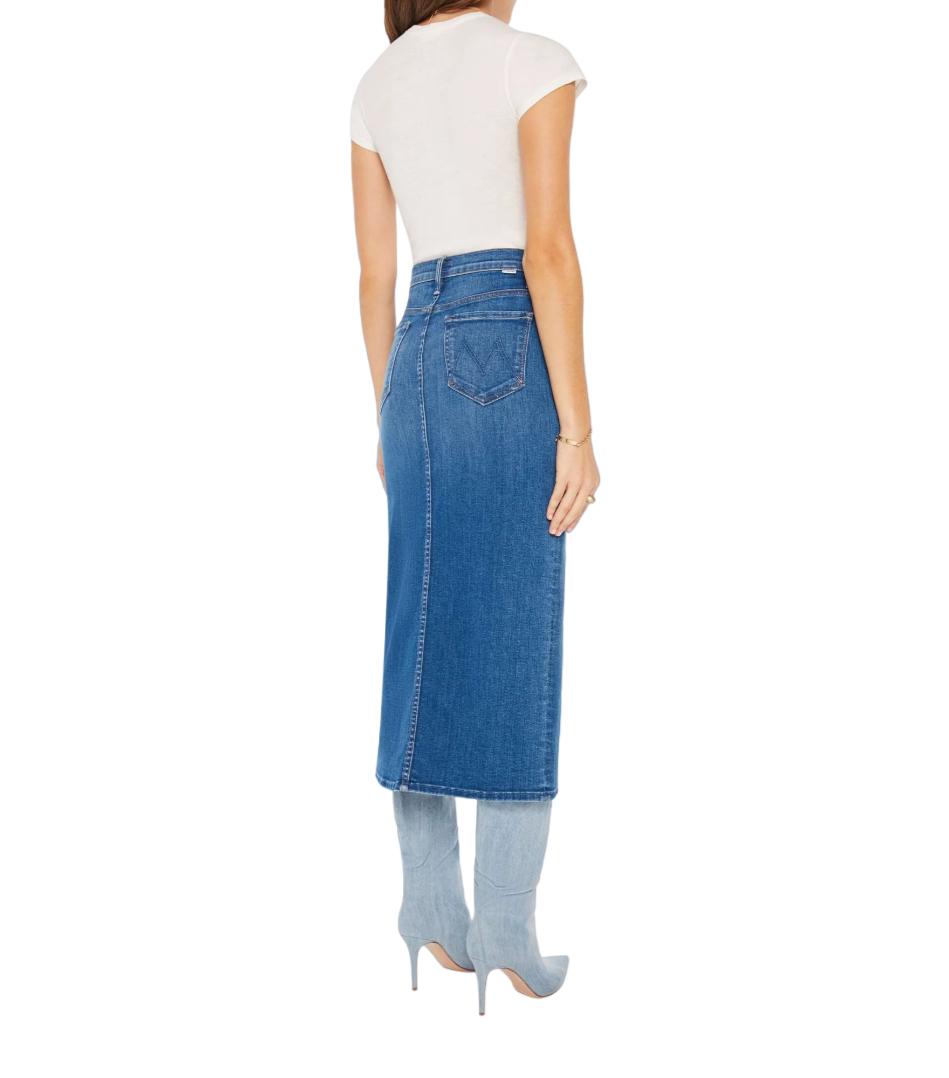 The "Reverse Pencil Pusher" from MOTHER features a high rise, narrow fit and a thigh-high front slit.