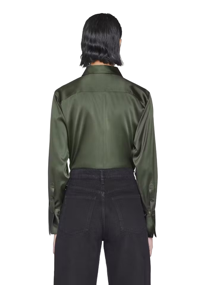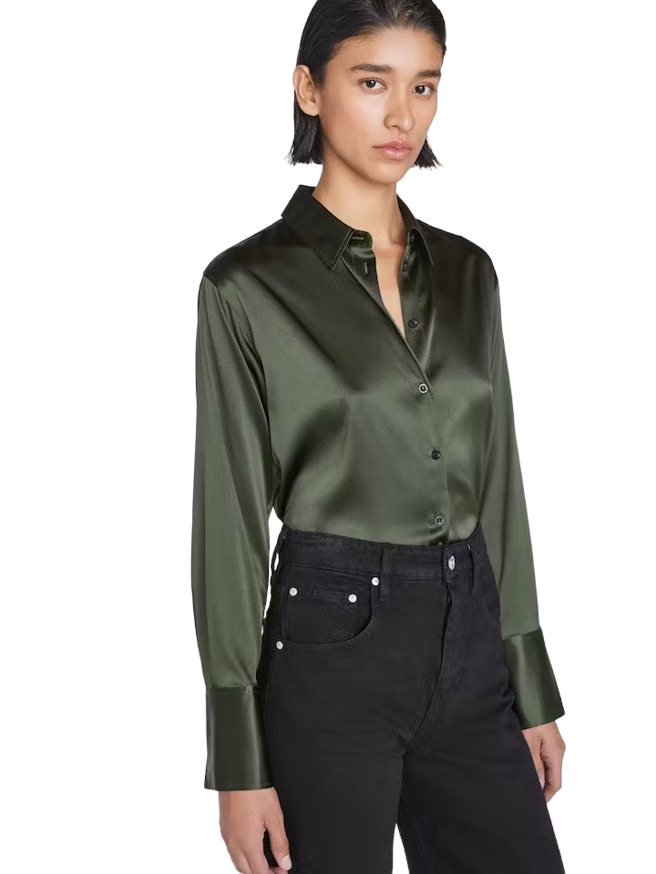 The "Gillian Long Sleeve Top" from Frame features a pointed collar, exposed button closure, draped fit, buttoned cuffs, and curved hem.