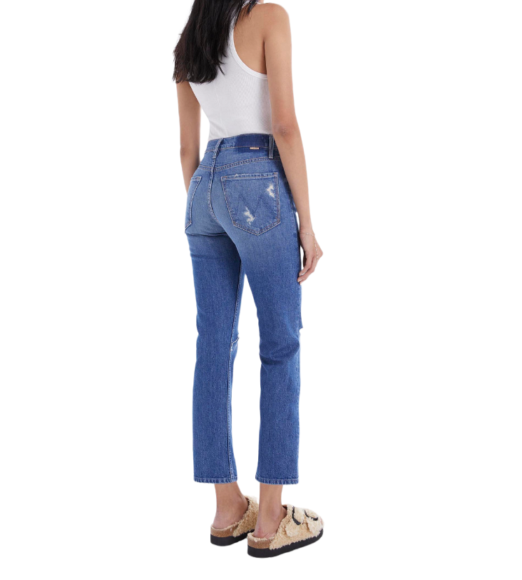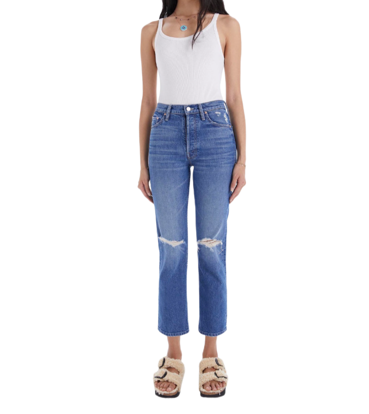 The "Tomcat - Playing With Scissors" from MOTHER is a high-rise straight leg with a button fly and an ankle-length inseam.
