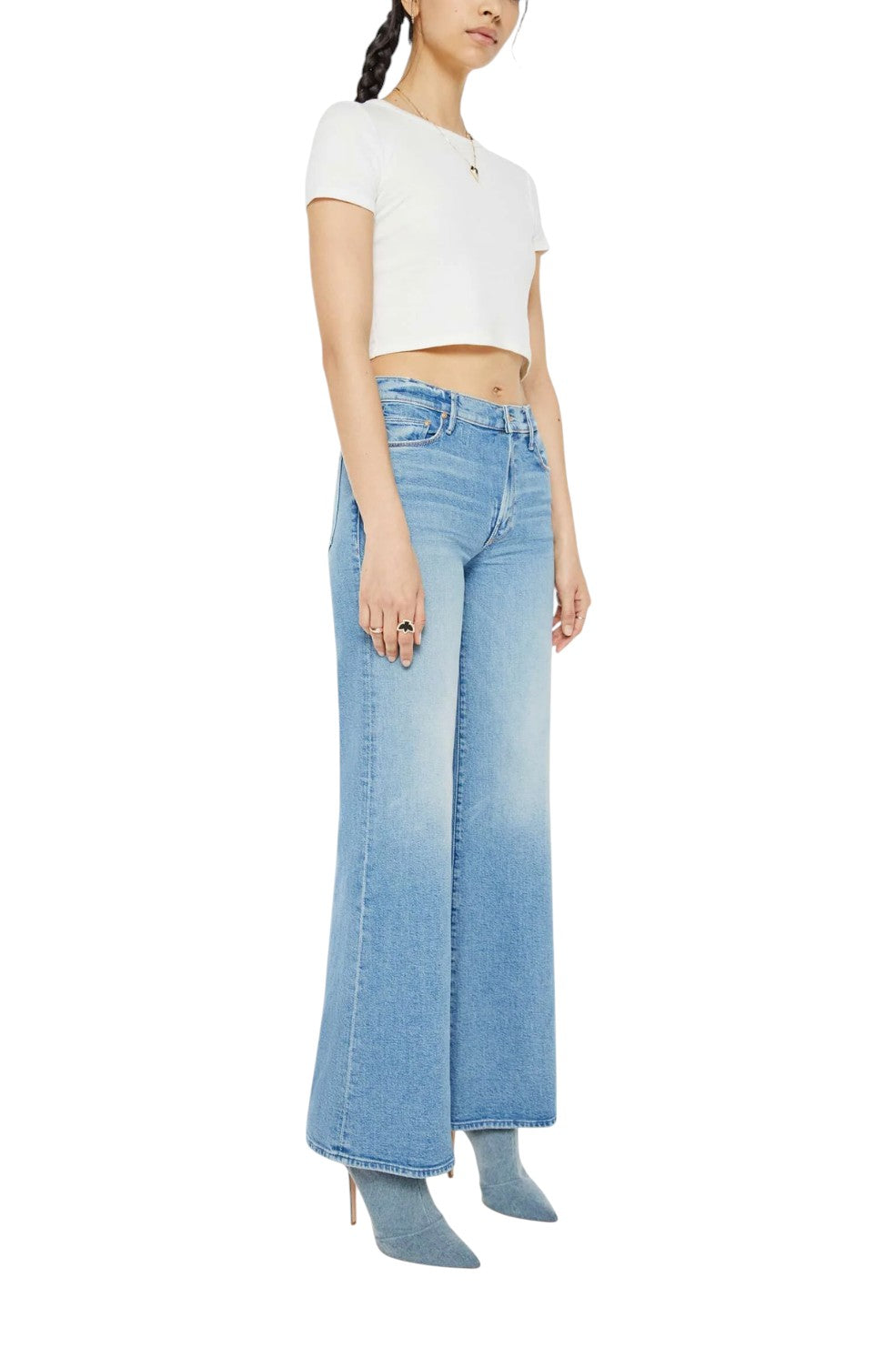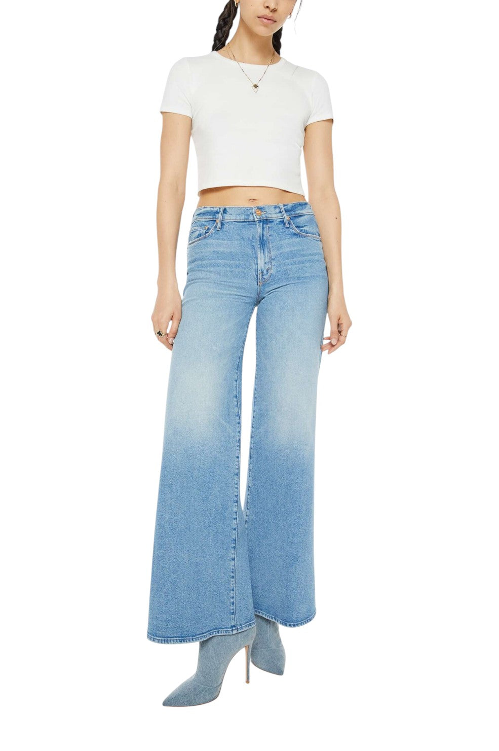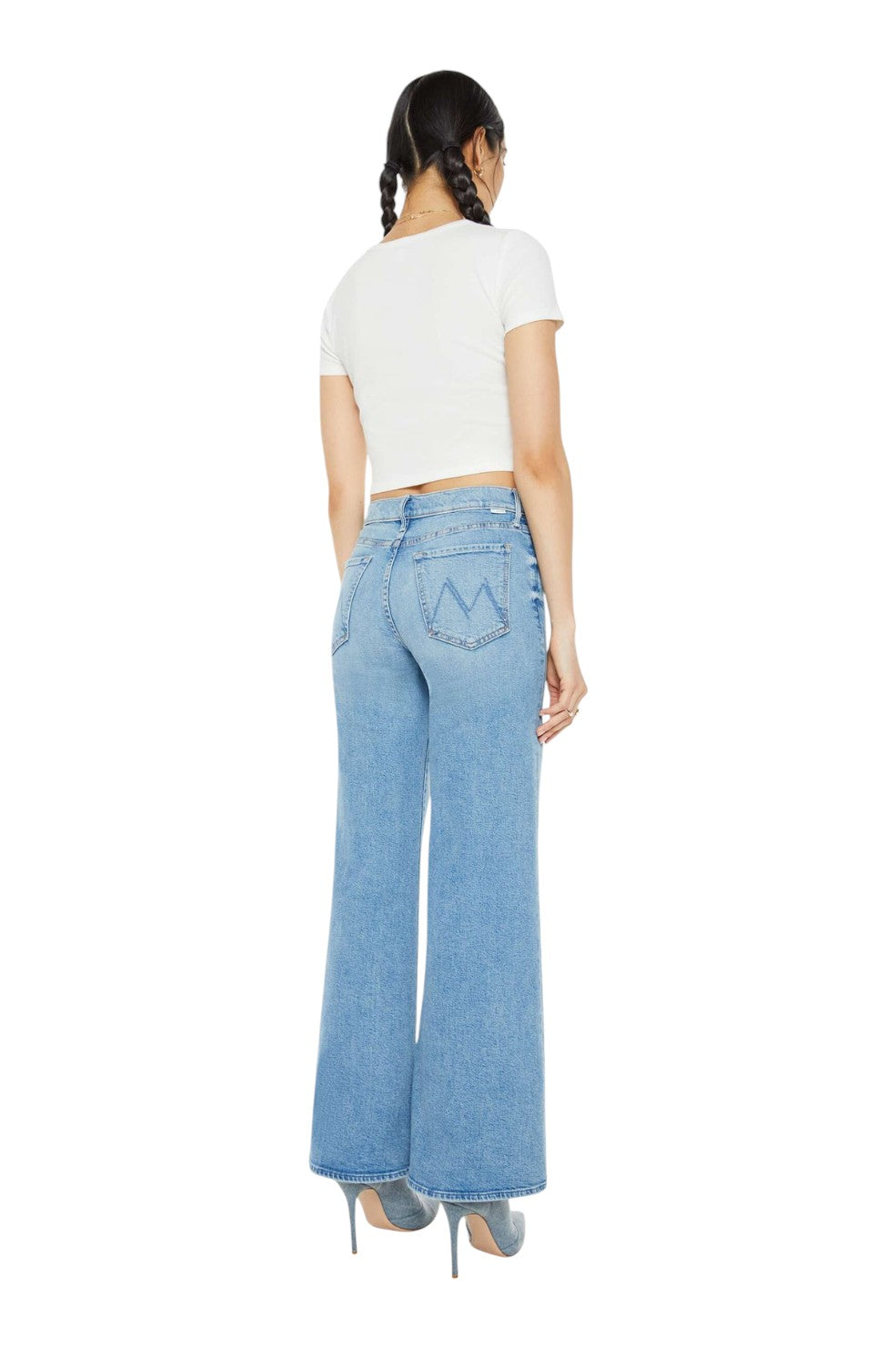 The "Twister Skimp" from MOTHER Denim is a pair of high-rise jeans featuring a flared, wide leg and a 33-inch inseam with a clean hem for a chic, elongated silhouette. Made from a blend of recycled stretch denim, the "Horseback to Quarterback" wash offers a light blue tone with subtle whiskering and knee fading, giving these jeans a perfectly worn-in look with an eco-friendly twist.